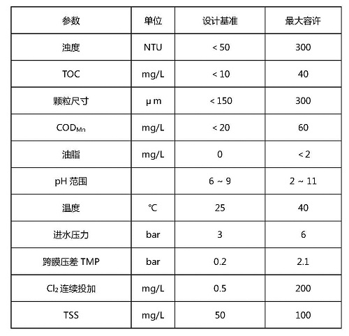 為了維持超濾膜性能的穩定,尤其是保持超濾膜透水速率的相對穩定,需要對超濾膜進水水質進行限定或考慮適當的預處理,以避免這些雜質含量過高而對超濾膜組件造成嚴重的膜污染。超濾膜的設計是基于如下表中所示的合格進水條件,但超濾膜可以短時間內承受最大允許進水水質。