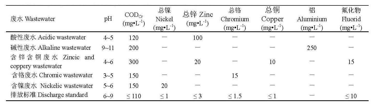 鋁合金輪轂生產廢水主要來源于輪轂涂裝堿洗工序的堿性廢水和電鍍生產線的酸性廢水、含鋅含銅廢水、含鉻廢水和含鎳廢水。各種類型廢水的主要污染物濃度如表 1所示。