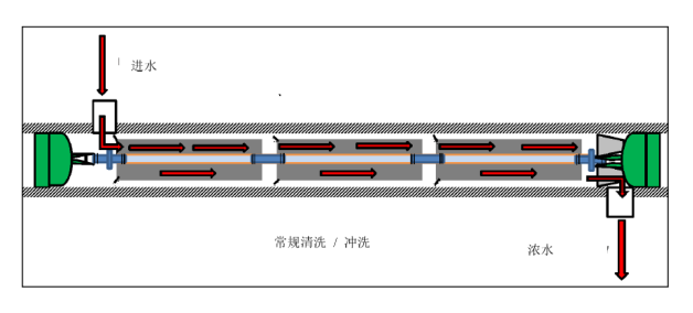 常見的反滲透的沖洗設計一般是從壓力容器進水端流入,經過膜元件后從壓力容器濃水端流出,這個流向與反滲透系統正常運行時是一樣的。反滲透的反向沖洗指的是由濃水端向進水端方向進行沖洗的過程, 反向沖洗有助于去除反滲透系統的前端污染物,采用此方法進行沖洗反滲透膜元件受到的污染更小;當有顆粒物(細砂、活性炭)時,必須采用此方法,以免反滲透膜表面被劃傷。需要注意的是任何時候嚴禁由產水端向進水端進行沖洗,這會造成反滲透膜元件背壓,使反滲透膜元件受到不可逆轉的損害。
