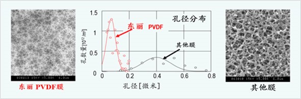 東麗的PVDF膜表面上孔的直徑小而均勻,相對(duì)于其他廠商的膜而言,東麗的PVDF膜不僅可生產(chǎn)高質(zhì)量的產(chǎn)水,還具有卓越的透水性能,并且可以防止膜孔的污堵。